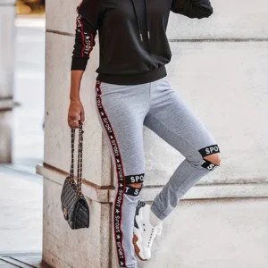 Plus Size Letter Print Two-piece Set, Long Sleeve Hooded Top & Cut Out Pants Outfits, Women’s Plus Size Clothing